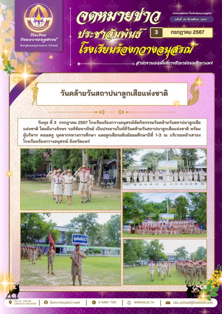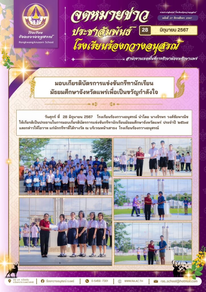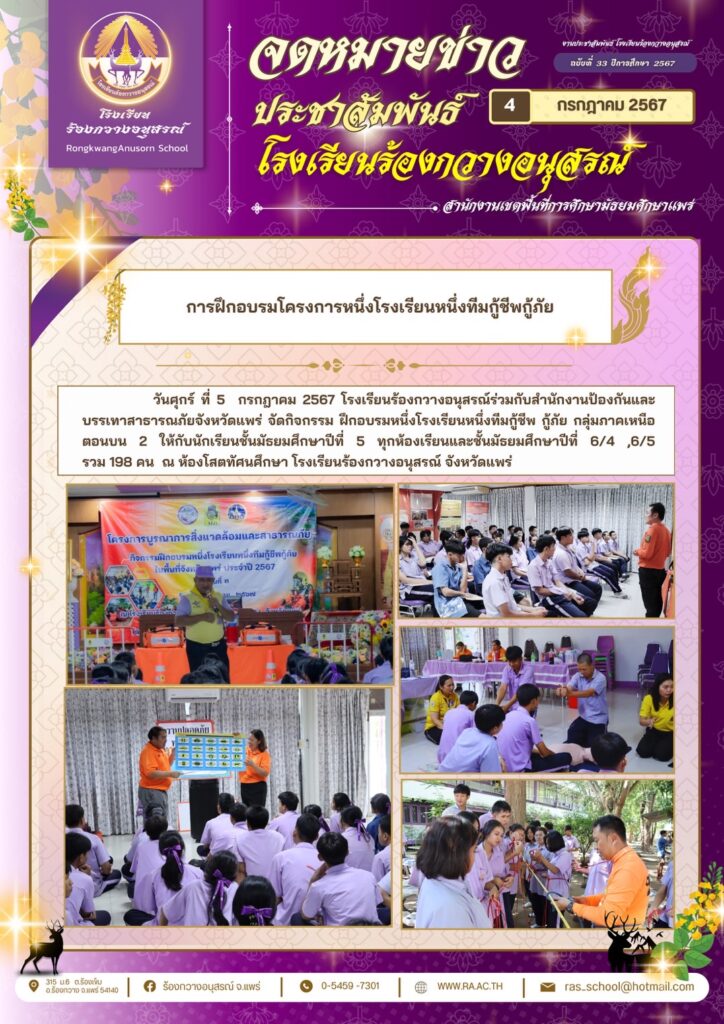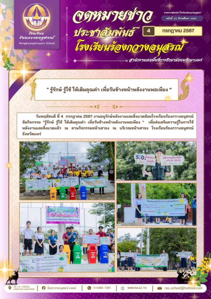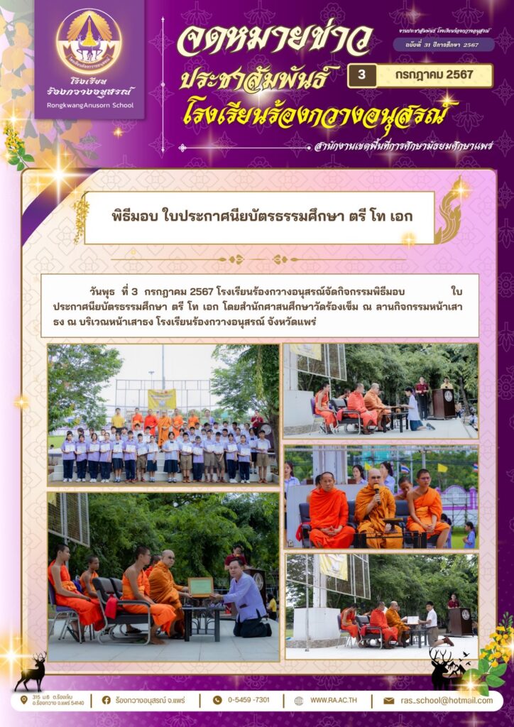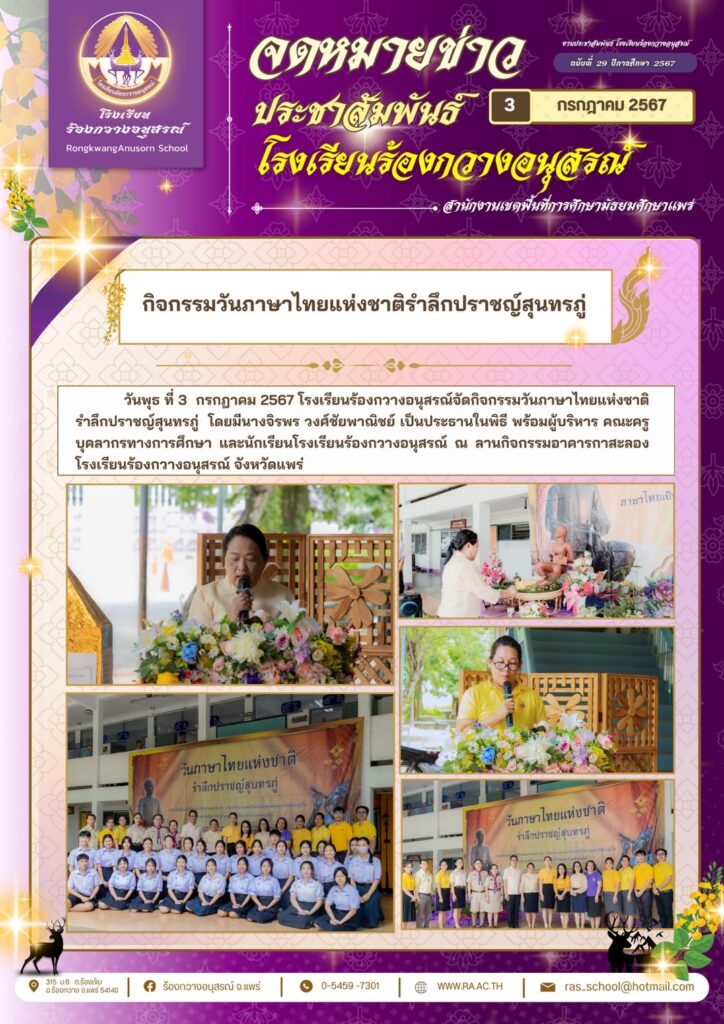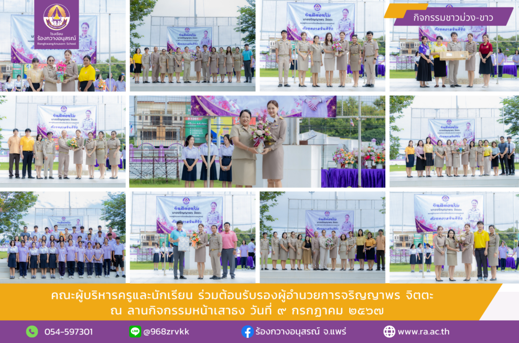 คณะผู้บริหารครูและนักเรียน ร่วมต้อนรับรองผู้อำนวยการจริญญาพร จิตตะ ณ ลานกิจกรรมหน้าเสาธง วันที่ ๙ กรกฏาคม ๒๕๖๗ กิจกรรม ม่วง-ขาว / By ra / 9 กรกฎาคม 2024 คลิกชมภาพกิจกรรม